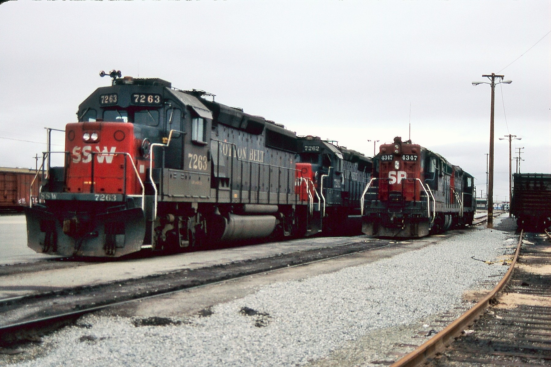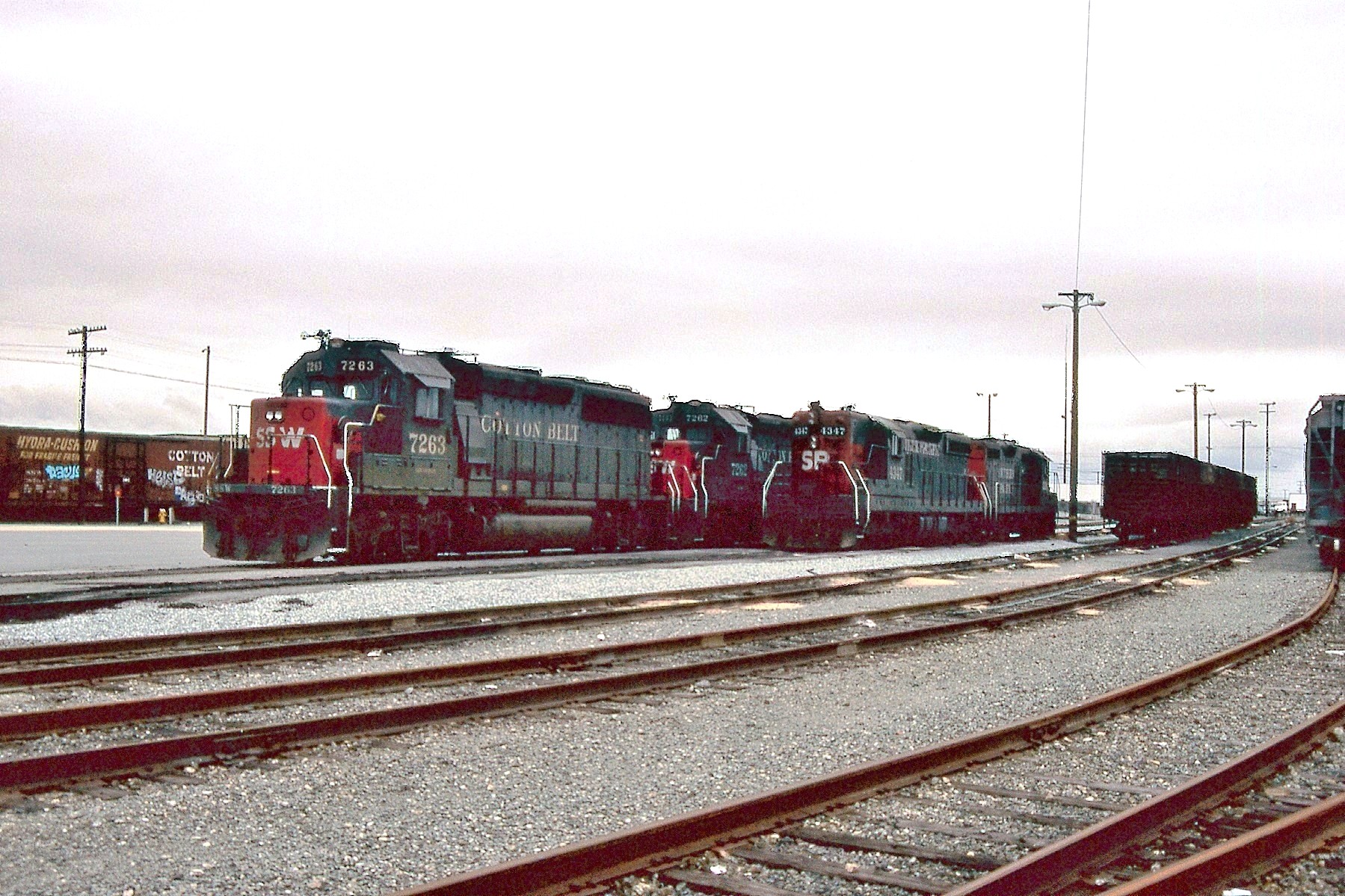 This loco was built in xx/1984 with EMD construction number 847046-16. She was built as a freight engine. She was painted in standard for the time bloody nose colors and featured large front plow, anticlimber, cab-roof air conditioner and a full 5 light headlight arrangement on both the front and rear end featuring Oscitrol oscilating headlights vs. the previous SP standard Gyralight.