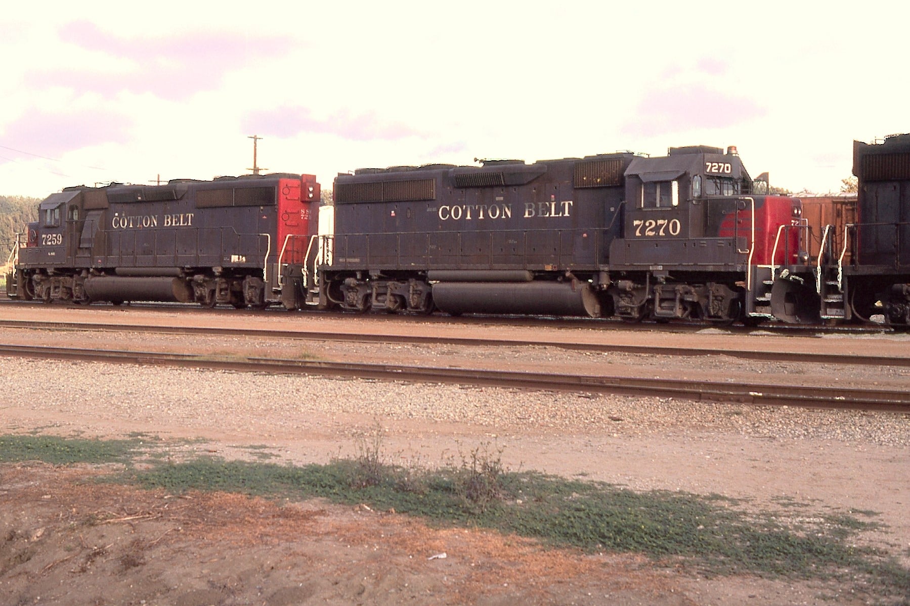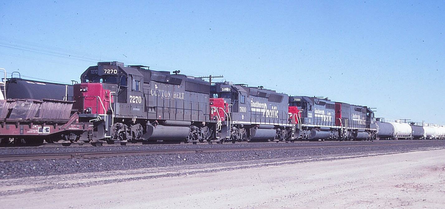 This loco was built in xx/1984 with EMD construction number 847046-23. She was built as a freight engine. She was painted in standard for the time bloody nose colors and featured large front plow, anticlimber, cab-roof air conditioner and a full 5 light headlight arrangement on both the front and rear end featuring Oscitrol oscilating headlights vs. the previous SP standard Gyralight.