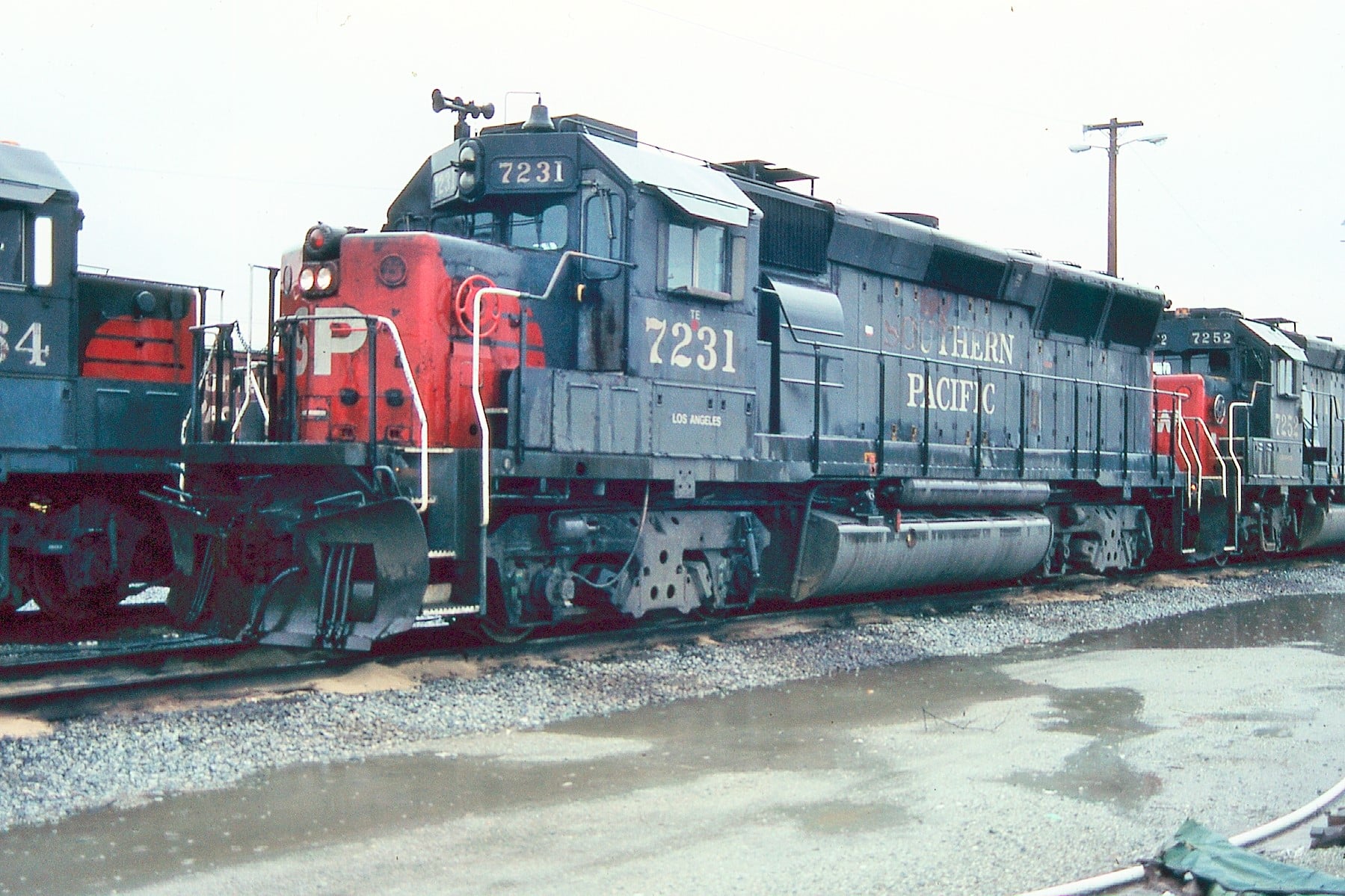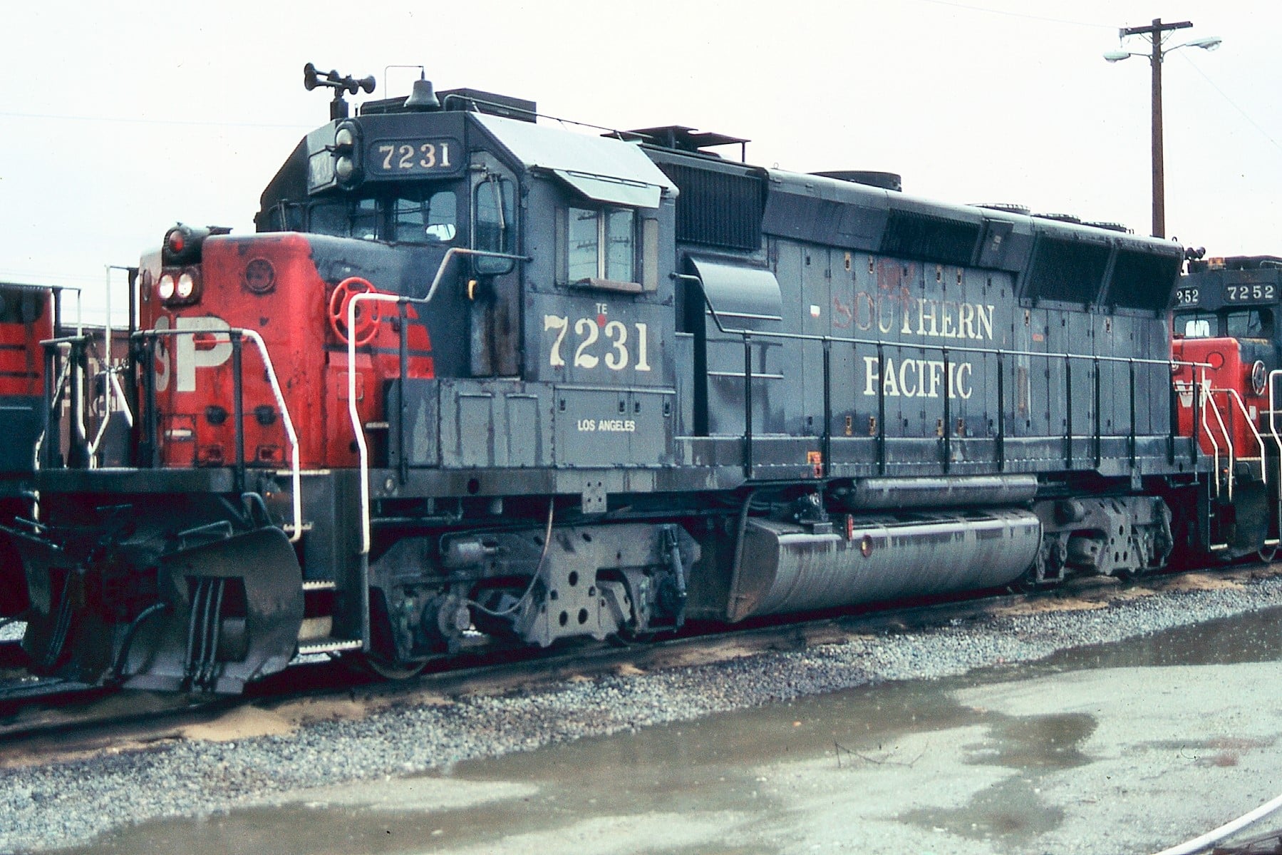 This loco was built in 2/1978 with EMD serial number 776016-04. She was built as a freight engine. She was painted in standard for the time bloody nose colors and featured large front plow, anticlimber, cab-roof air conditioner and a full 5 light headlight arrangement on both the front and rear end.