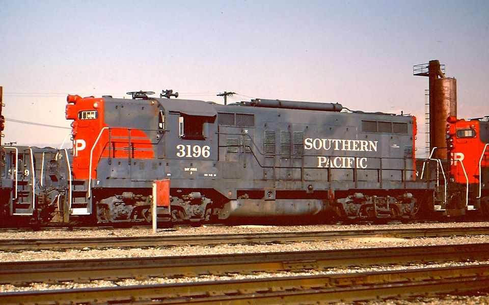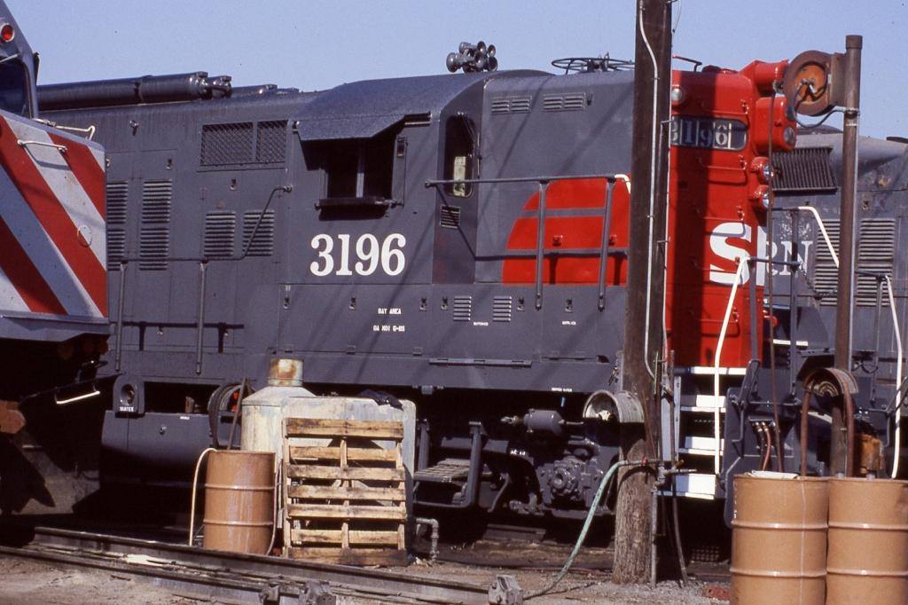 This loco was built in 4/1955 with EMD builder's number 19977. It was built as a passenger engine with a boiler in the nose. It was setup with dual control stands for operation in either direction, thus it had wings on the front and rear. It was painted in standard for the time black widow colors and featured Pyle oscilating dish signal lights on both ends and rooftop air resevoirs for increased fuel and water capacity between the trucks.