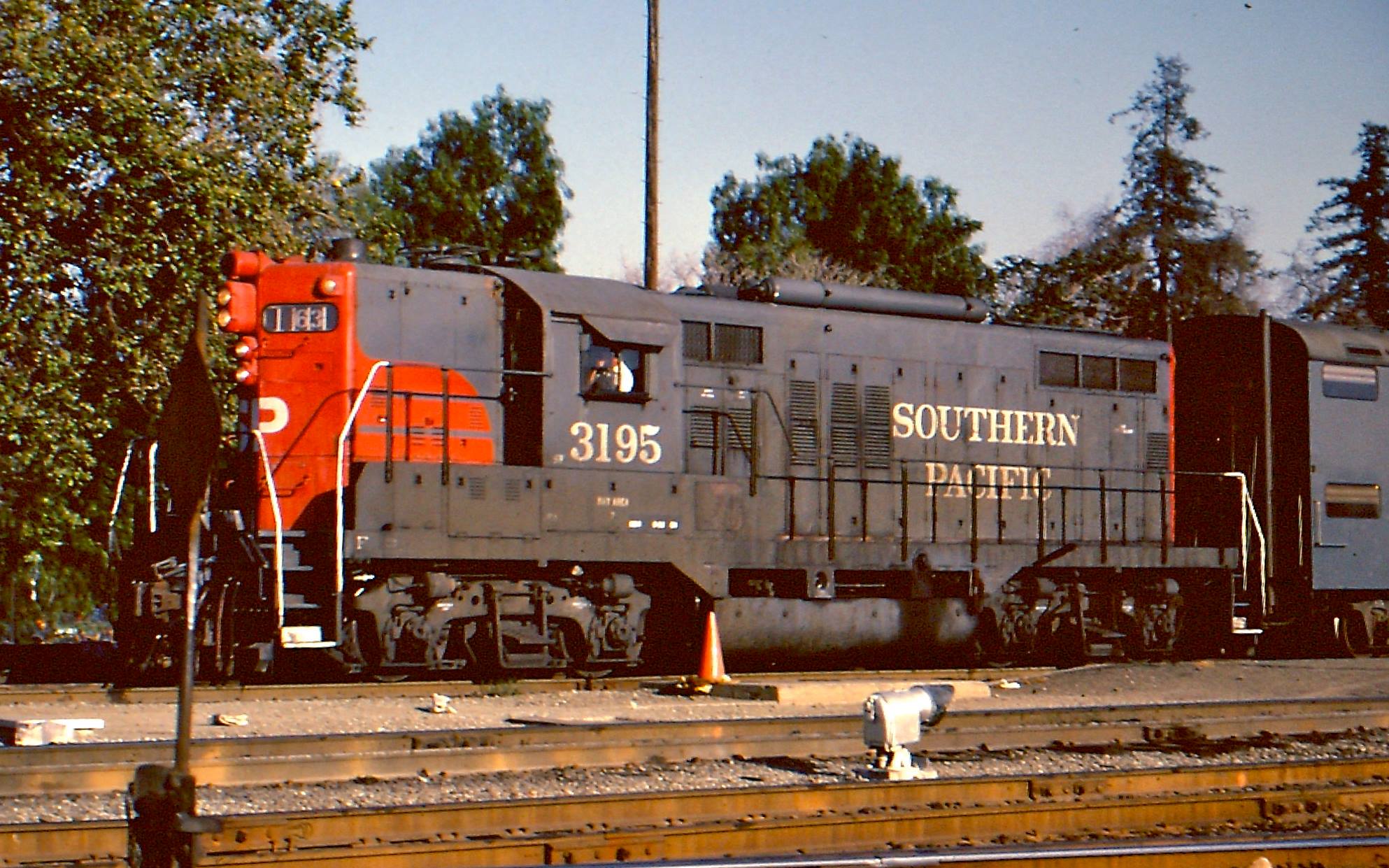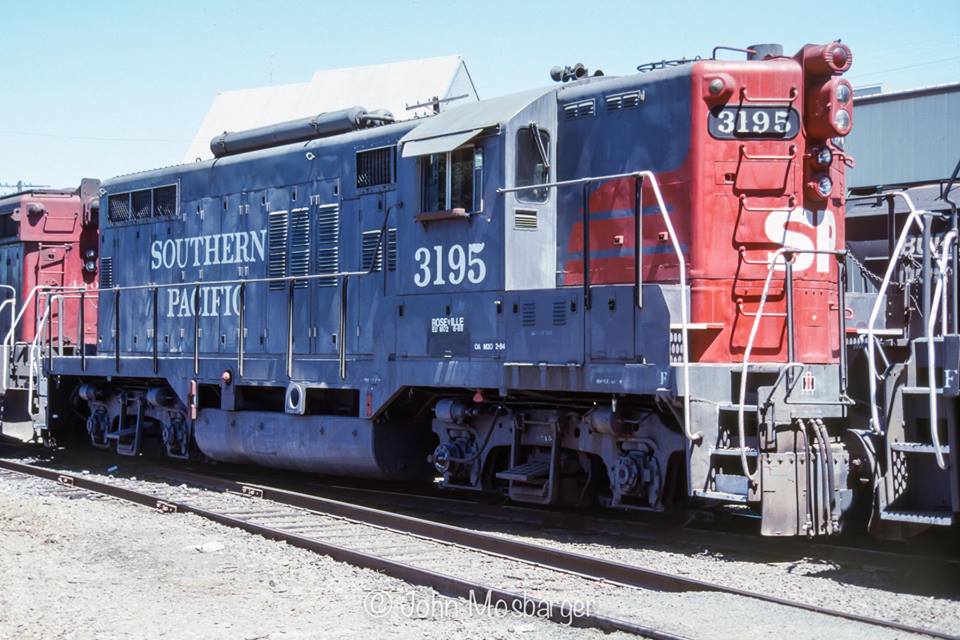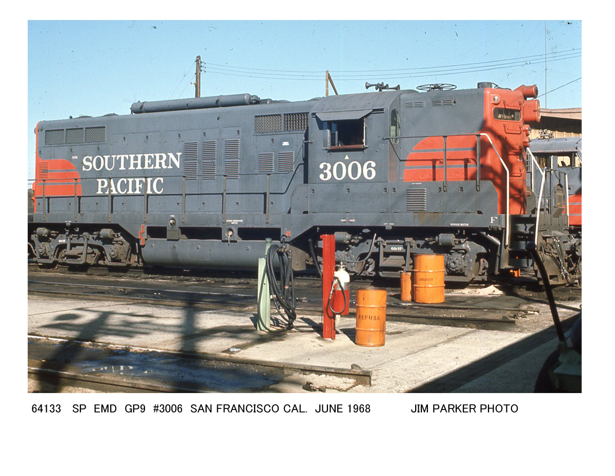 This loco was built in 4/1955 with EMD builder's number 19979. It was built as a passenger engine with a boiler in the nose. It was setup with dual control stands for operation in either direction, thus it had wings on the front and rear. It was painted in standard for the time black widow colors and featured Pyle oscilating dish signal lights on both ends and rooftop air resevoirs for increased fuel and water capacity between the trucks.