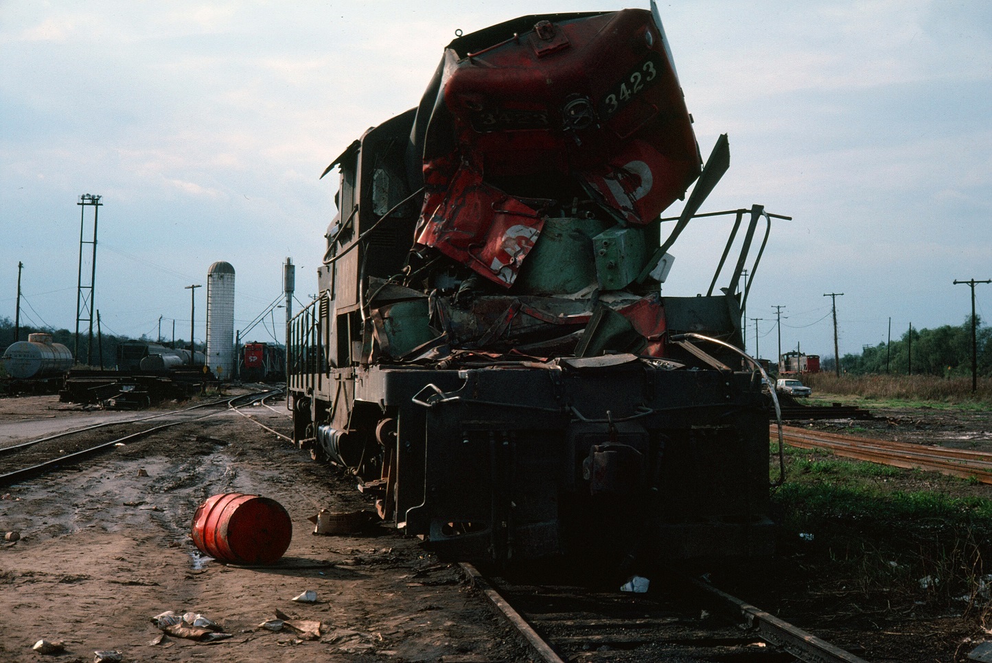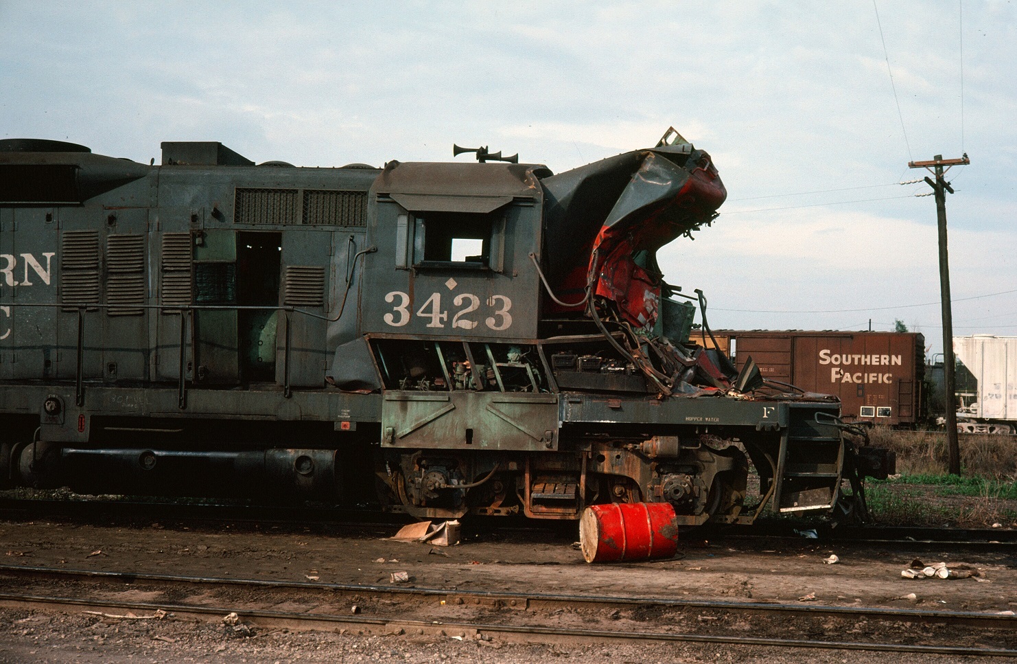 This locomotive was involved in an accident at Boutte, LA (just west of Avondale) on 12/15/1978 where the train struck a loaded tanker truck. There were 3 non-crew fatalities. SP engineer Roger Ohlsson snapped these pics a few days after the accident at Avondale yard. Here is a link to an accident report on the incident.