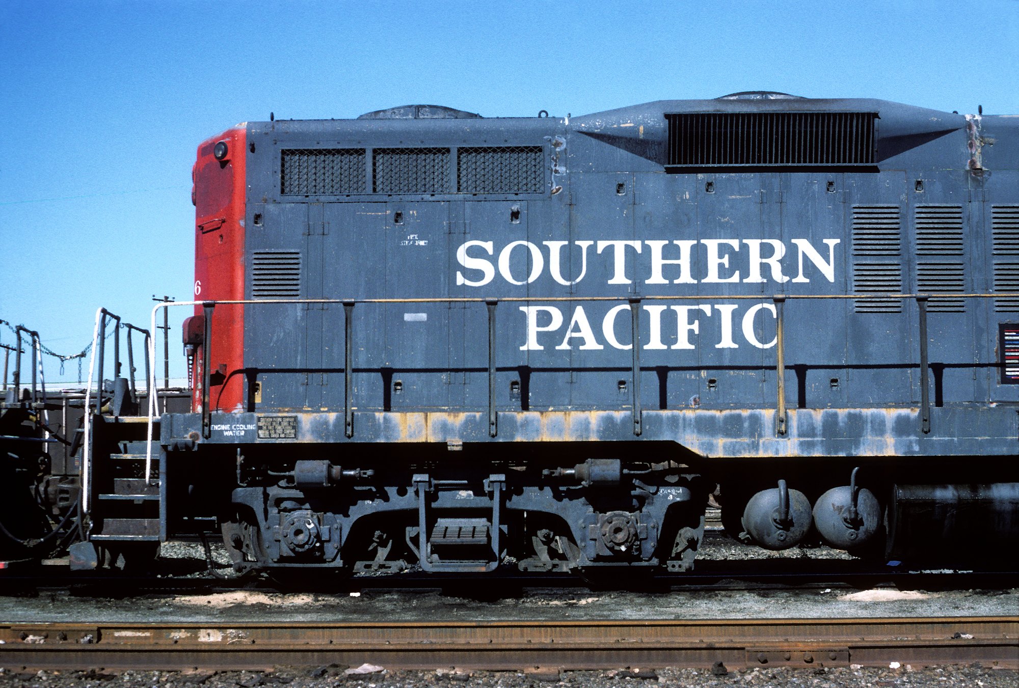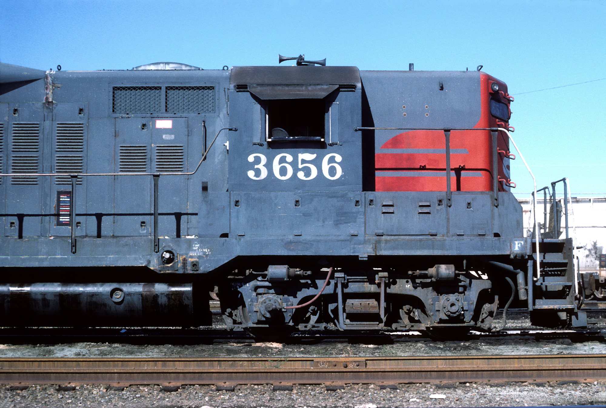This loco was built in 2/1959 with EMD builder's number 25148. She was built as a freight engine. She was painted in newly standard grey and red or "bloody nose" colors and featured a single dual sealed beam headlight on each end.