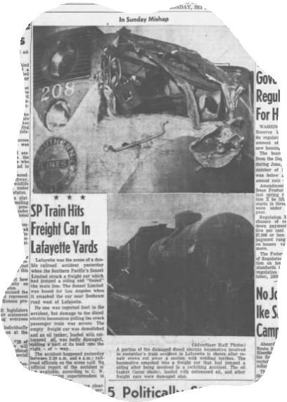 SP TRAIN HITS FREIGHT CAR IN LAFAYETTE YARDS Lafayette was the scene of a double railroad accident yesterday when the Southern Pacific's Sunset Limited struck a freight car which had jumped a siding andfouledthe main line. The Sunset Limited was bound for Los Angeles when it smashed the car near Sunbeam Road west of Lafayette. No one was reported hurt in the accident, but damage to the diesel electric locomotive pulling the crack passenger train was severe. The empty freight car was demolished and all oil tanker, loaded with cottonseed oil, was badly damaged, spilling a part of its load onto the right-of-way. The accident happened yesterday between 3:30 a.m. and 4 a.m.; railroad officials on the scene said. No official report of the accident is yet available, according to C.W. Rush, assistant superintendent in the Lafayette office. The main line track was cleared for train passage in about seven hours after the Sunset Limited hit the loose car, Rush reported. Repair and section maintenance crews worked yesterday to clear and repair tracks for the waiting trains. TRAINS DELAYED Scheduled trains and regular freights were not detoured but were held from passing the Lafayette depot and at other points. Rush said that only one other passenger train and a freight train carrying perishables were officially delayed by the wreck. No official report of the accident is available from SP officials. Railroad men and evidence at the scene of the accident indicates that twocutsof freight cars being switched in the yards side-swiped, causing a freight car to break loose, jump the tracks and foul the main track. Several cars were damaged in the side-swipe accident. Some were derailed and a switch plus several sections of track were smashed, Crewman said. The diesel locomotive pulling the passenger train carried its freight car about 200 yards down the track. The first unit of the locomotive was derailed and was damaged about the front end. Repair crews had in use welding torches to cut the freight cars loose from the locomotive and the Lafayette Fire Department was called as a safety measure in case the diesel fuel ignited. Unofficial sources estimated the Limited speed at 35 miles per hour. It has been gathering speed after a stop at the Lafayette depot. Lafayette Daily Advertiser 9/15/1952.