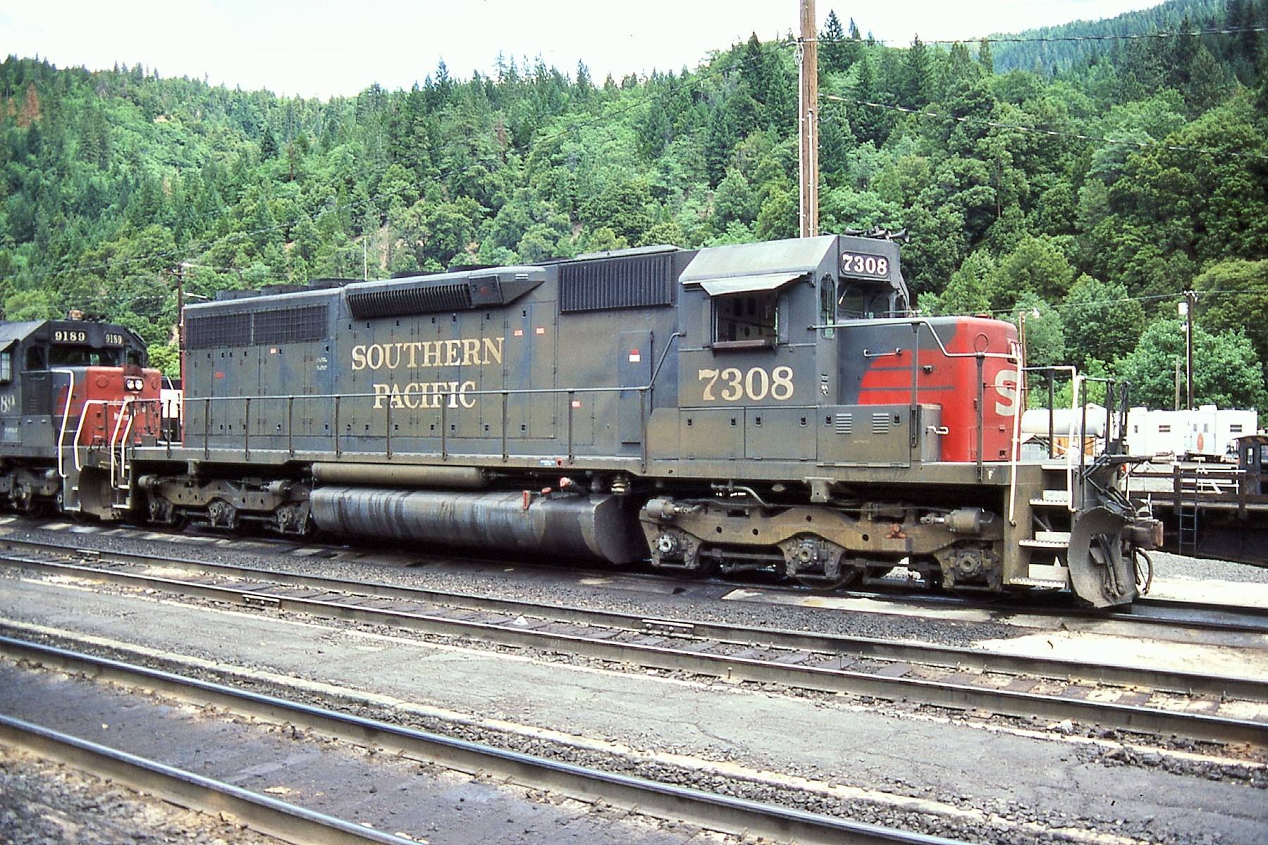 She was rebuilt and renumbered to SP 7308 as part of the SP's GRIP program on 07/23/1980. The most visible external change was the addition of a full set of Gyralight to the rear of the unit.