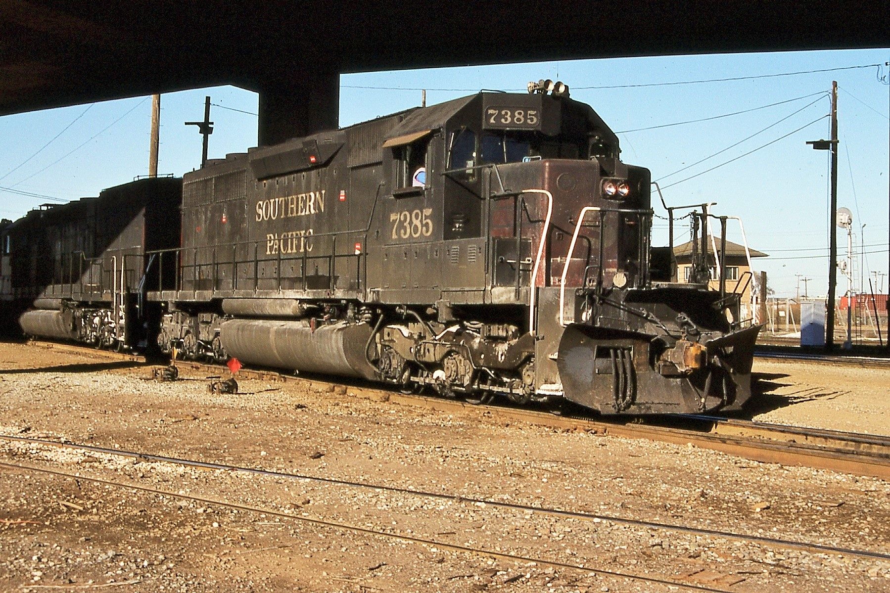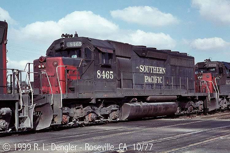 She was rebuilt and renumbered to SP 7385 as part of the SP's GRIP program on 08/28/1981. The most visible external change was the addition of a full set of Gyralight to the rear of the unit.
