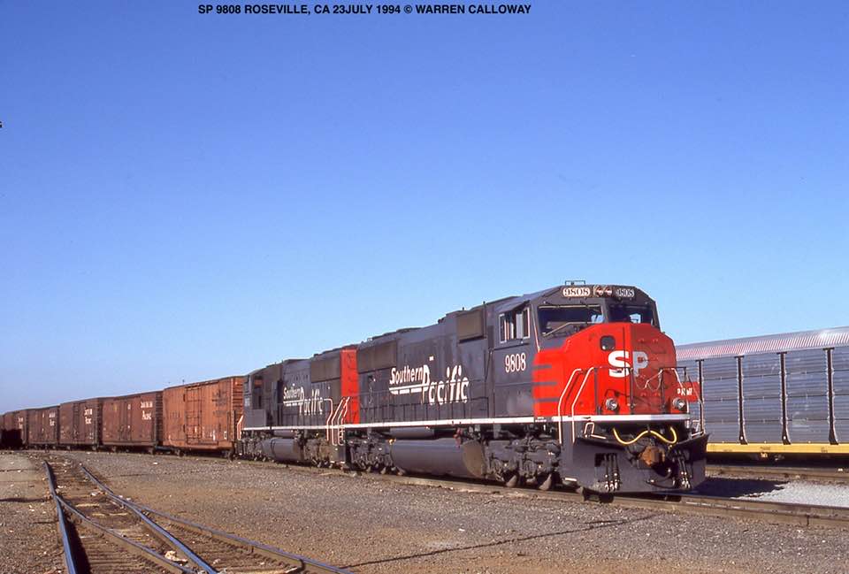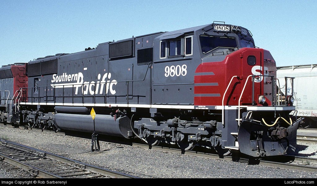 This loco was built in 6/1994 with EMD serial number 936438-9. She was built as a freight engine, model SD70M. She was painted in standard for the time bloody nose colors with SP speed lettering and a North American cab. Her headlight arrangement was a single sealed beam headlight each end and ditch lights along the front anticlimber only.