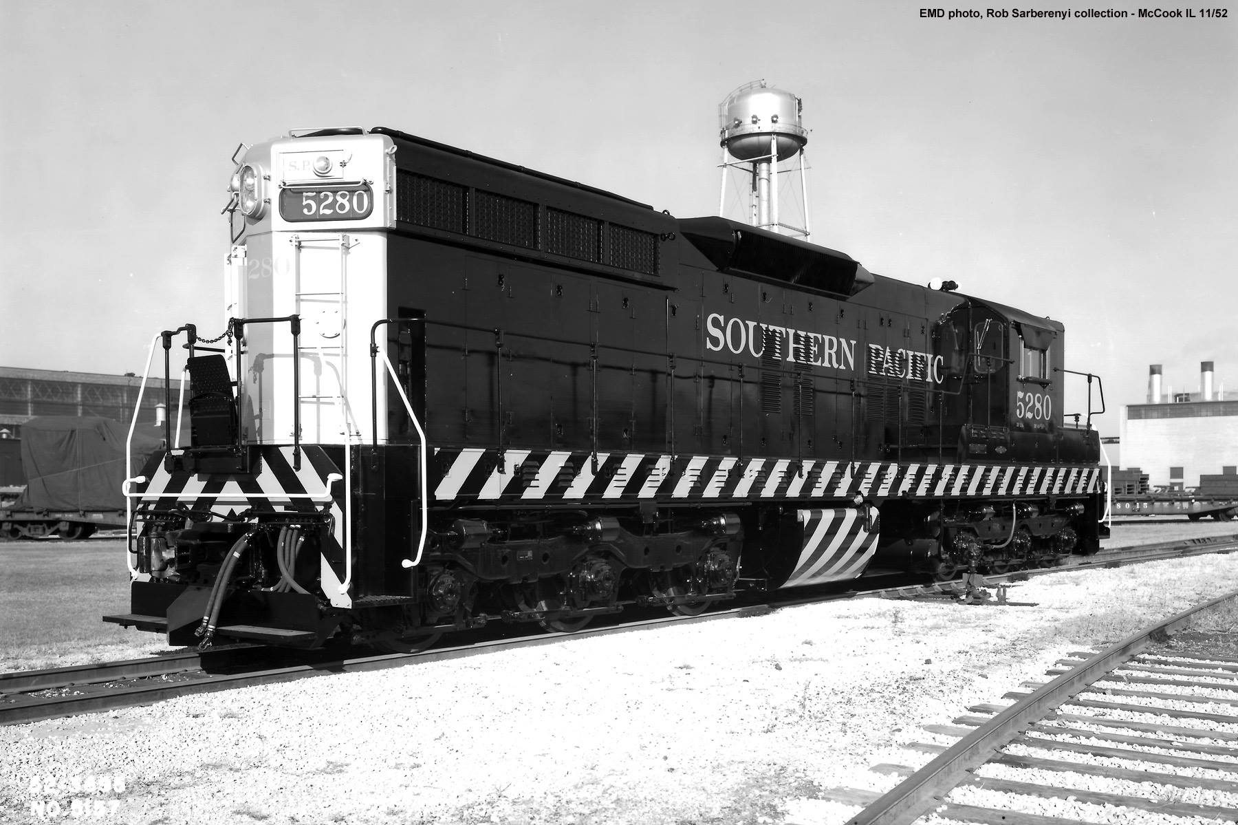This loco was built in 11/1952 with EMD construction number 17145. It was built as a freight engine. It was painted in standard for the "tiger stripe" colors. The SP added an ash can headlight arrangement on each end shortly after delivery.