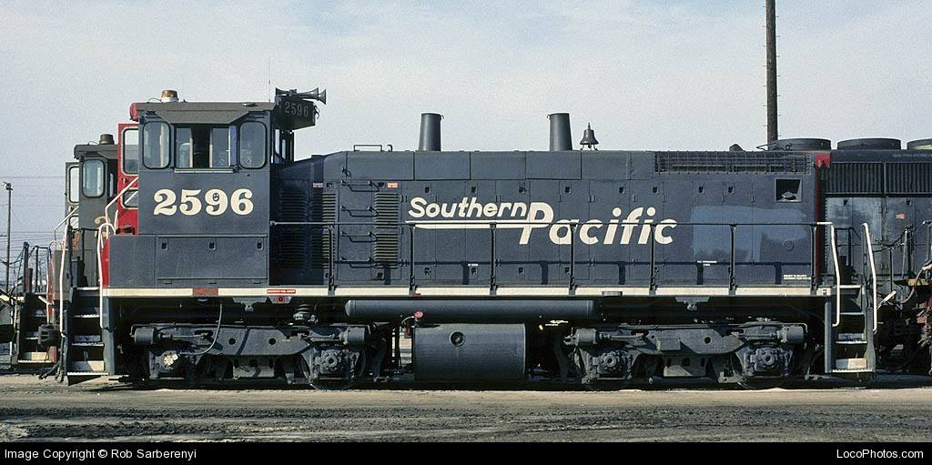 The merger of the SP and Rio Grande railroads brought the Speed Lettered paint scheme, which was applied to various locomotives (and freight cars.) :