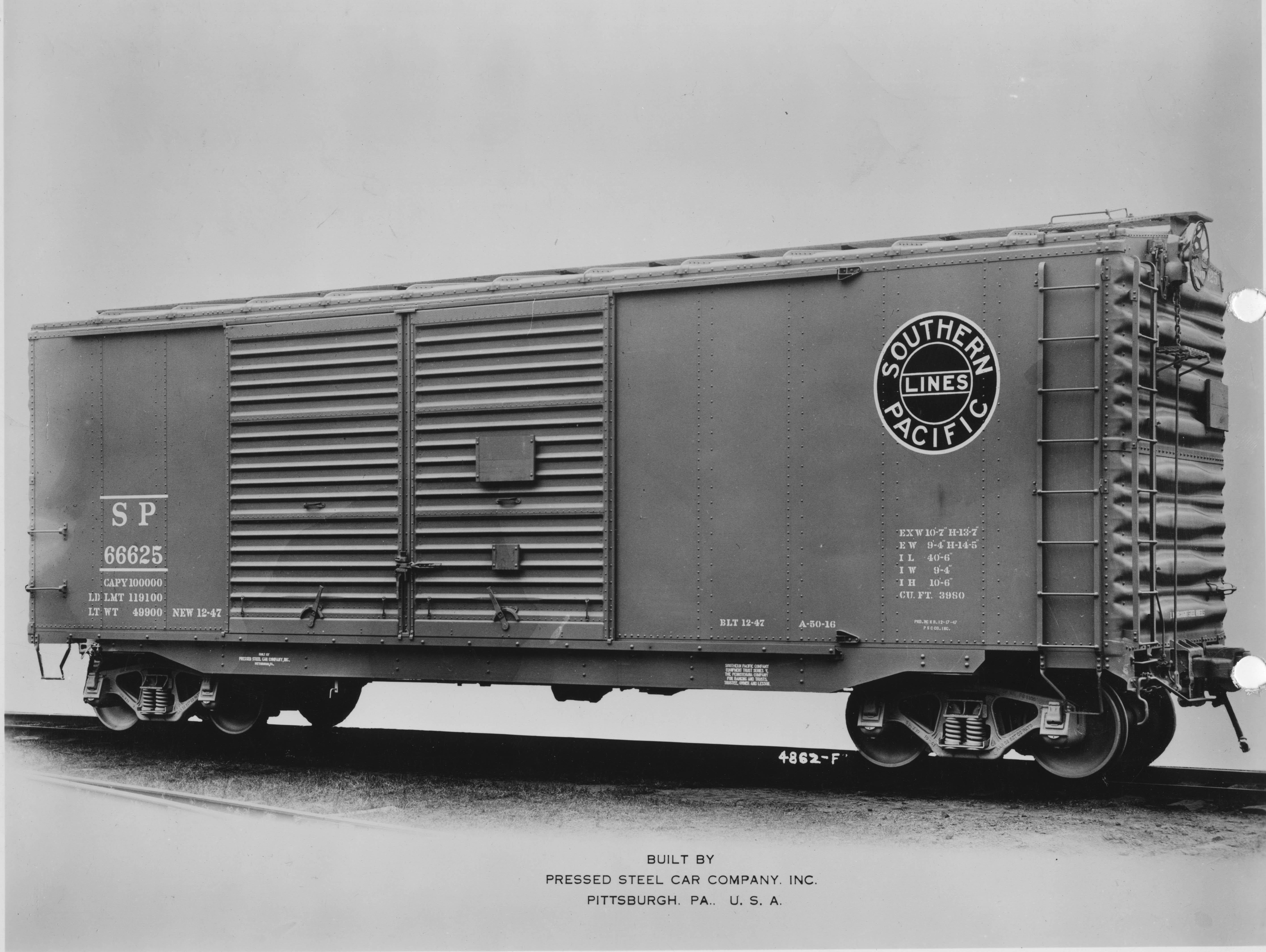 These 40'-6" all-steel automobile box cars were built by Mount Vernon Car Co. (owned by Pressed Steel Car Co. at the thime) in 11-12/1947. They featured double sliding doors with a 14'-7" opening, Improved Dreadnaughtends, steel grid running boards and 3960 ft3 capacity.