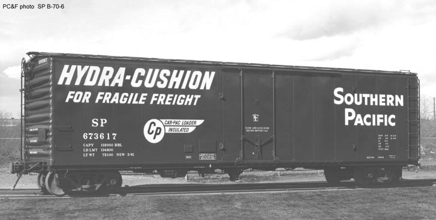 These 50'-1" insulated box cars were built by PC&F in 1961-62 and featured 9'-0" Youngstown plug doors, Hydra-Cushion underframes, Car Pac loaders and 4644 ft3 capacity. Many of these cars were later rebuilt as B-70-6R's.