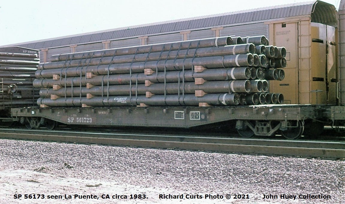 These cars were built in 1949-50 by American Car & Foundry. They featured a 53'-6" loading platform and were rivited in construction. Many of these cars were converted to specialized service such as Flo-bin, Tote-bin and Coil Steel. All of the cars were originally Pacific Lines cars with the T&NO cars being leased as above. These cars were a very important part of the SP freight car roster through the 80's. Many were placed into SPMW service as crane boom tenders, wheel flats, carrying Burro cranes and as part of welded rail trains.
