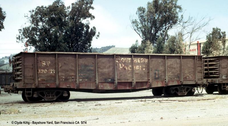 These 40'-1" sulphur gondolas were built by AC&F in 1941 and featured wood sides and 1905 ft3 capacity when originally constructed to combat the corrsive effects of the sulphur. They were later rebuilt with steel sides for general service and renumbered into the parent SP's numbering system.