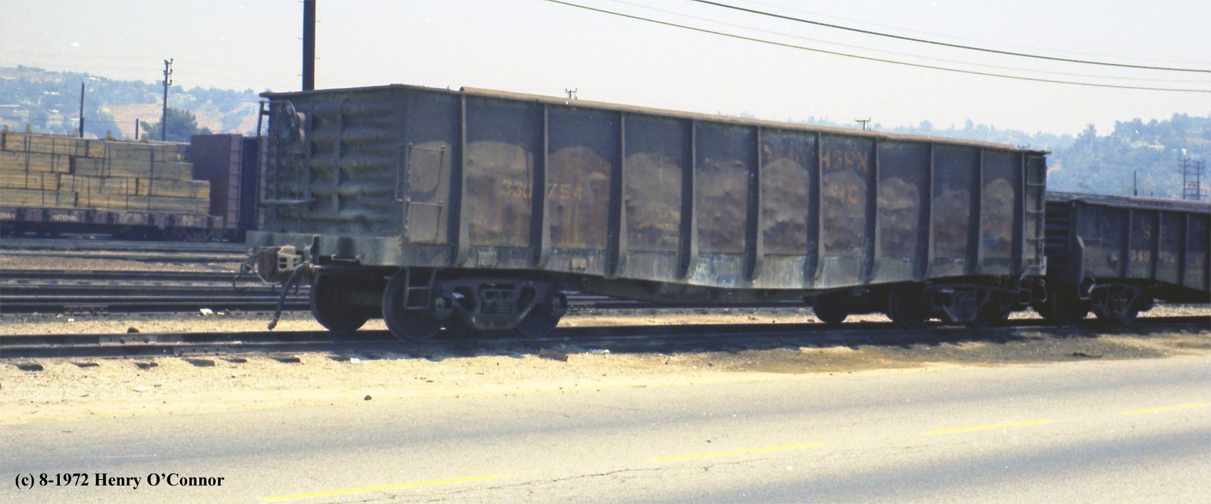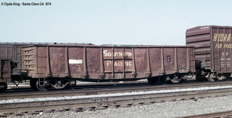 These 40'-1" sulphur gondolas were built by the T&NO shops at Algiers, LA in 1953 and featured wood sides and 1573 ft3 capacity when originally constructed to combat the corrsive effects of the suphur. They were later rebuilt with steel sides for general service and renumbered into the parent SP's numbering system.