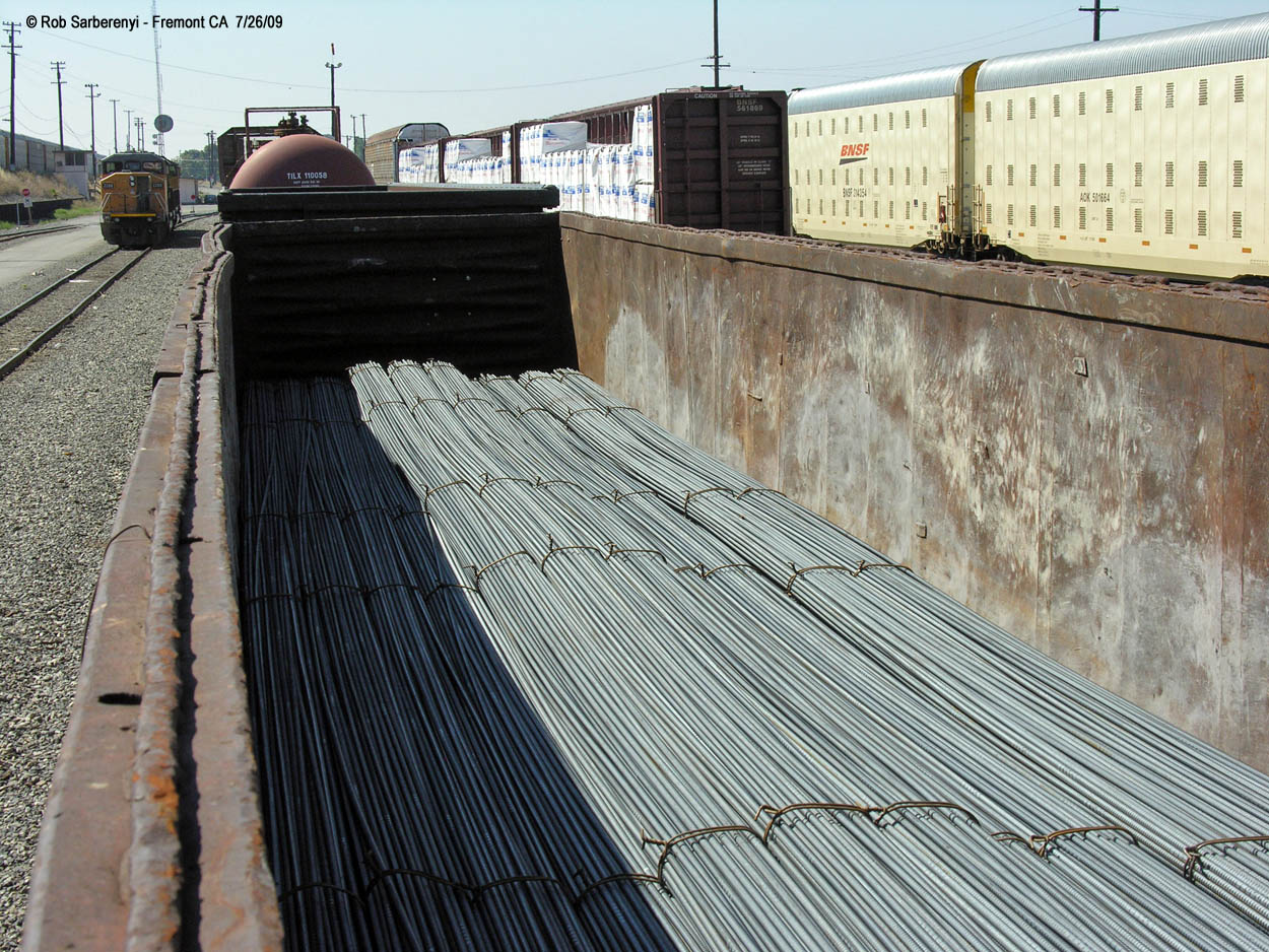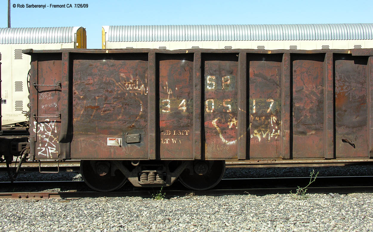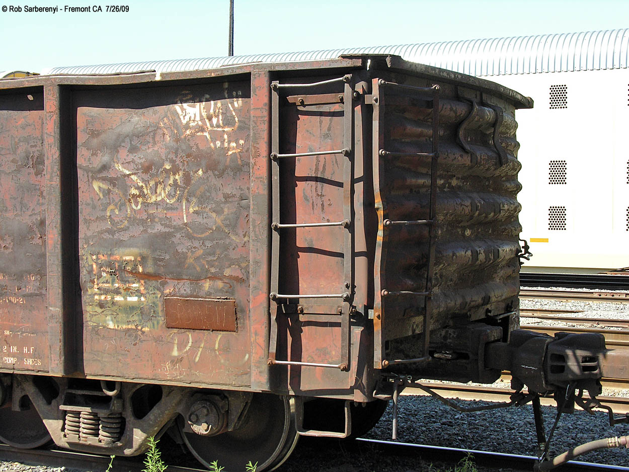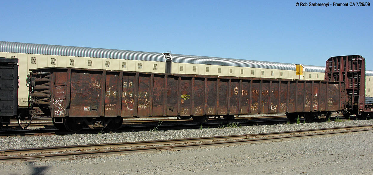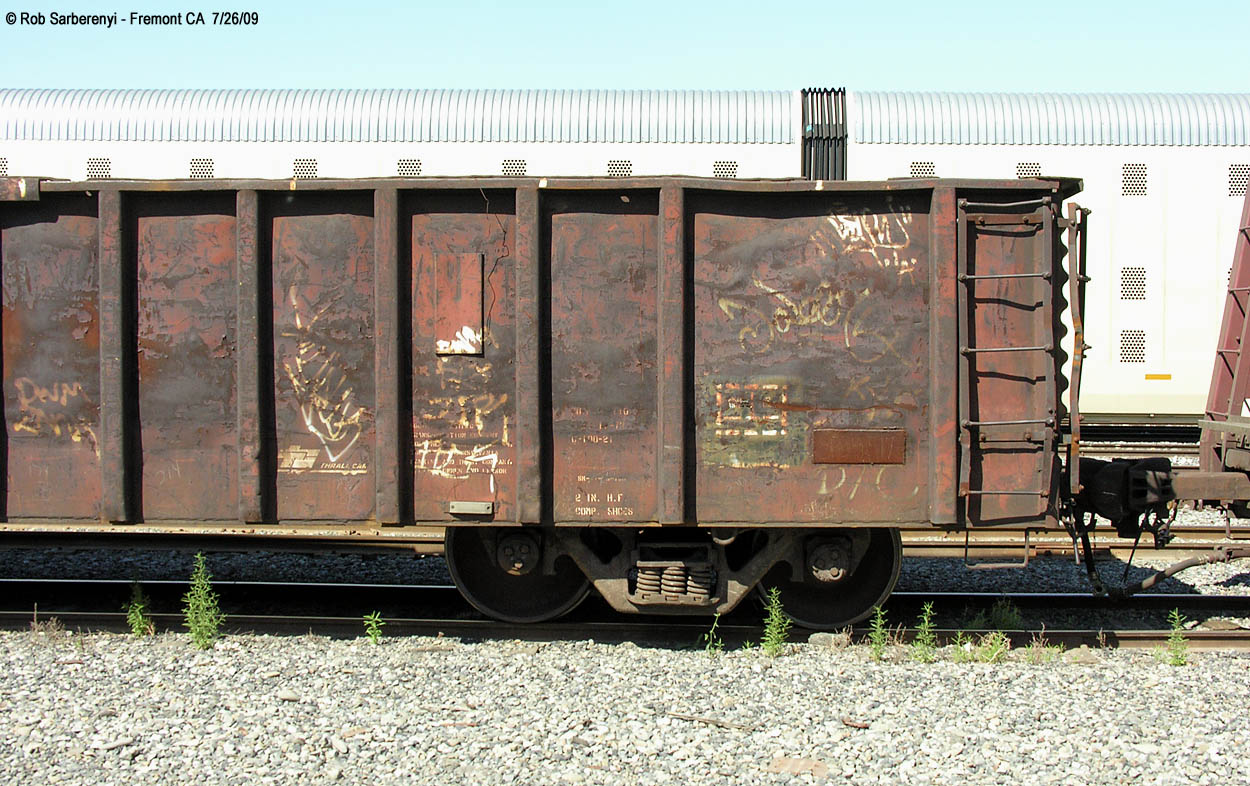These 65'-6" mill gondolas were built by Thrall in 1973 and featured 5'-3" inside height and 3110 ft3 capacity. The trucks are noticably inset from the ends of the car. Note that these cars are 9" taller than the very similar G-100-22 class cars.