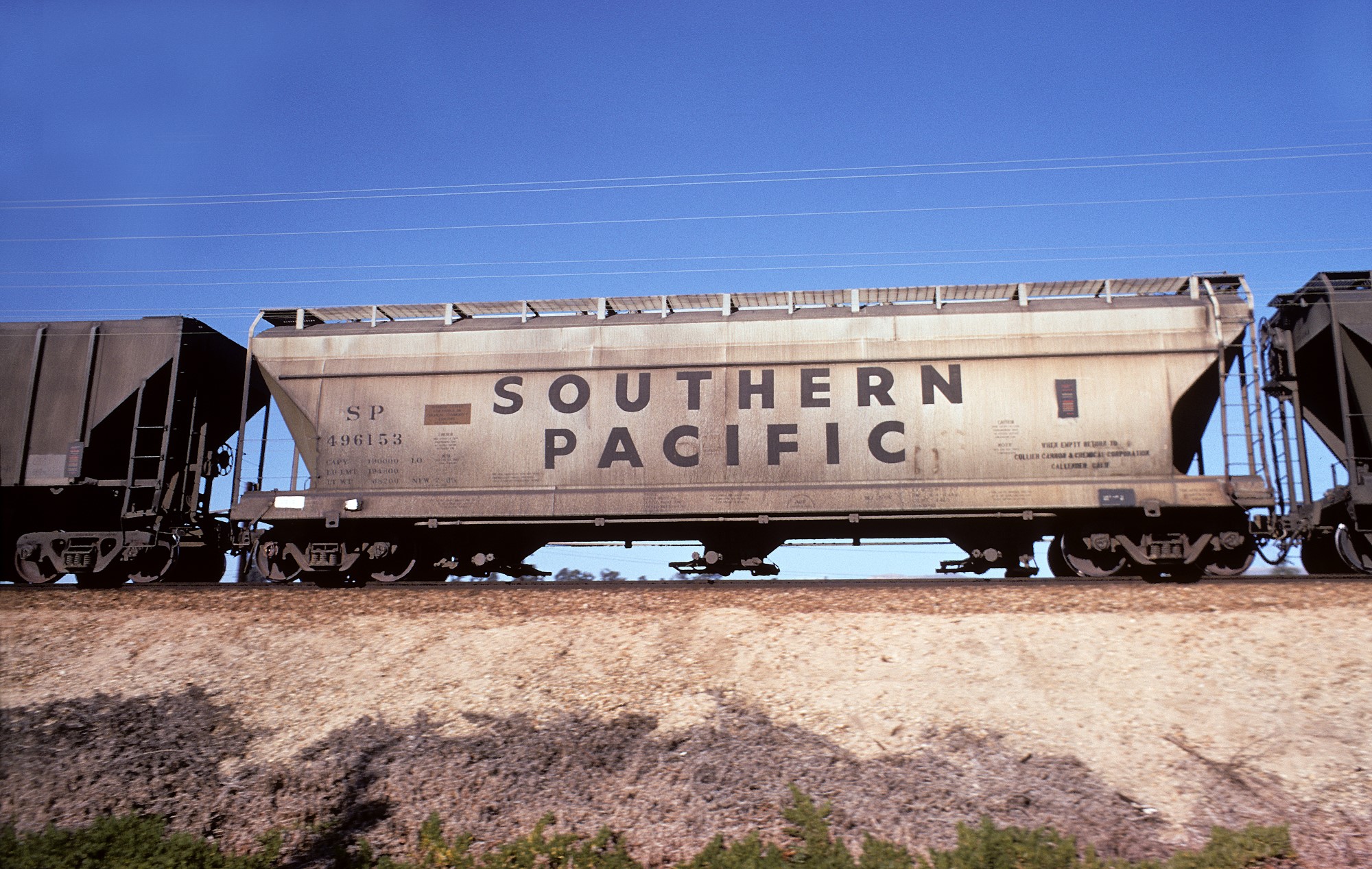 These 3-bay Center-Flow (CF4460) covered hopper cars were built by American Car & Foundry in 1965. All cars were painted grey with large black lettering and featured three longitudinal trough hatches for loading and 4460 ft3 capacity. These were the only AC&F cars of 4460 ft3 capacity on the SP among a multitude of 4650 ft3 cars. Many of these cars were rebuilt and renumbered as H-100-12R's.