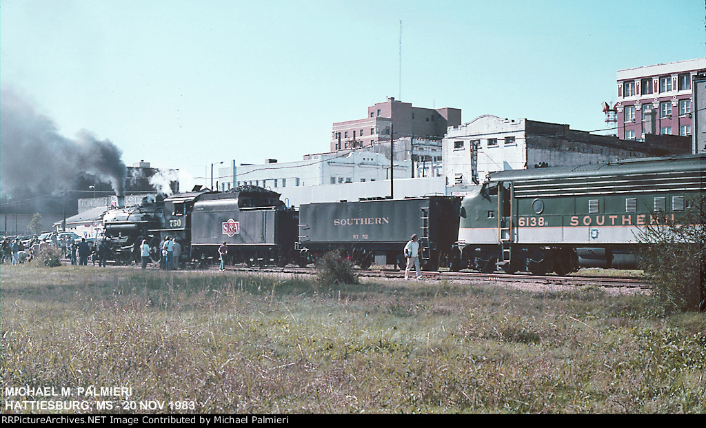 S&A 750 4-6-2 & FP7's 6138 & 6147 to Hatteuburg, MS. This is the only visit by the smaller S&A 4-6-2 to the Crescent City. She was assisted by a pair of Southern FP7's. I recall that the FP7's were running elephant-style (both facing forward) on the Saturday trip that we rode. I believe the trailing diesel was turned for the Sunday trip. I am assuming that it was done after the train's arrival back at NOUPT between the two trips.