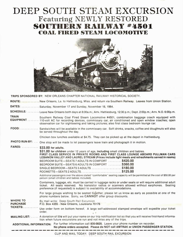 This year's trips were to be remembered for the load of bad coal that caused 4501 to not steam properly on the Saturday trip thus forcing the Southern to add GP38 SOU 2723 ahead of the steam locomotive at some point north of Slidell. At Hattiesburg the diesel was moved behind the canteen and remained there for the return trip to NOUPT and the Sunday trip.